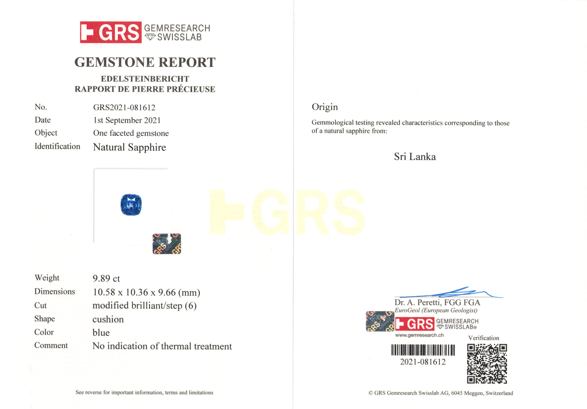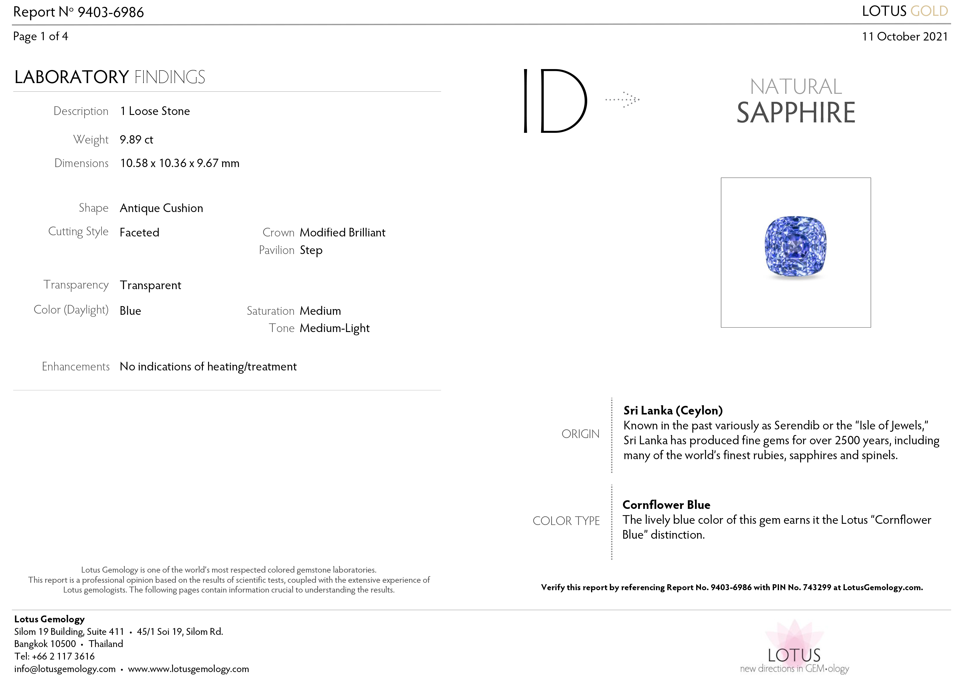 This natural & unheated/untreated blue sapphire of exceptional quality comes from Ceylon (Sri Lanka), historically known as the "Isle of Jewels". Ceylonese sapphires are renowned for their beautiful color with a high level of clarity/radiance, and this crystal is no exception. Weighing an impressive 9.89 carats, this gem exhibits a vivid cornflower blue color - likened to the flowering cornflower plant with its spread of intense-blue petals - as well as a soft, inviting glow permeating through its antique-cut cushion shape. In addition, it's completely free of eye-visible inclusions or imperfections. It's easy to see in this stone why blue sapphires are the national gemstone of Sri Lanka. It truly embodies the character of the land. |