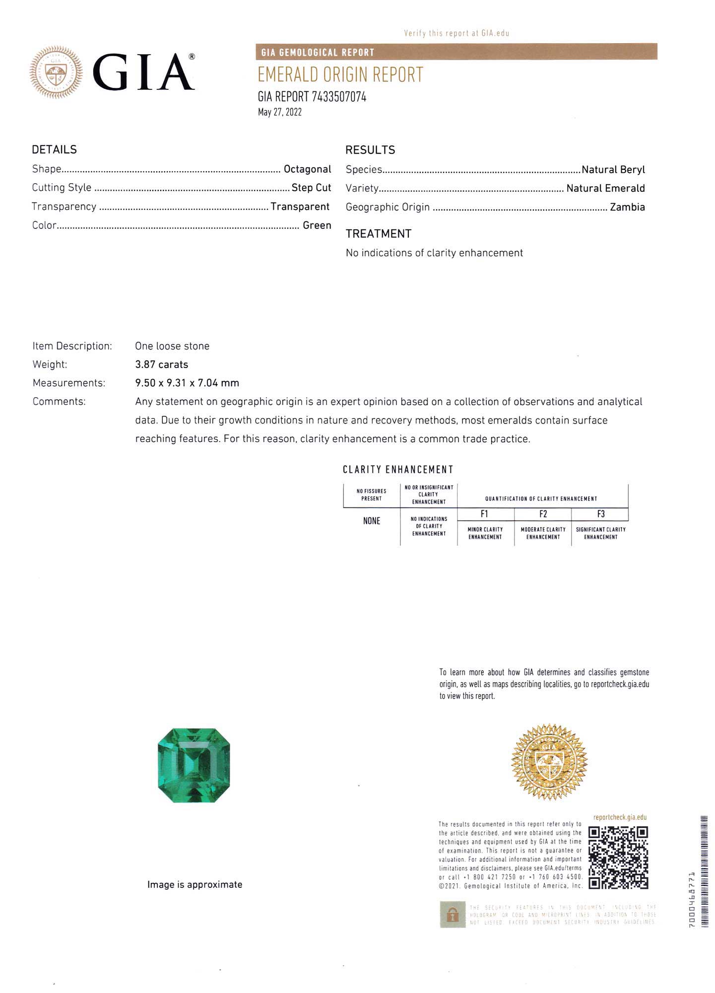 Gemological Institute of America report # 7433507074