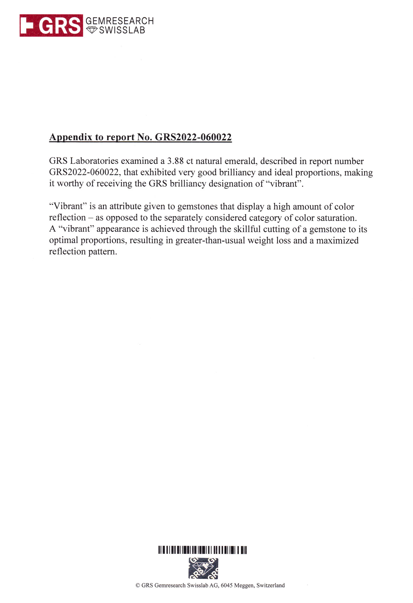 The accompanying GRS report describes the brilliancy-type as "vibrant" with a special comment on the appendix stating that the gemstone exhibited very good brilliancy and ideal proportions, making it worthy of receiving the GRS brilliancy designation of "vibrant". GRS awards this term only to select gemstones that meet their specific "vibrant" brilliancy criteria.