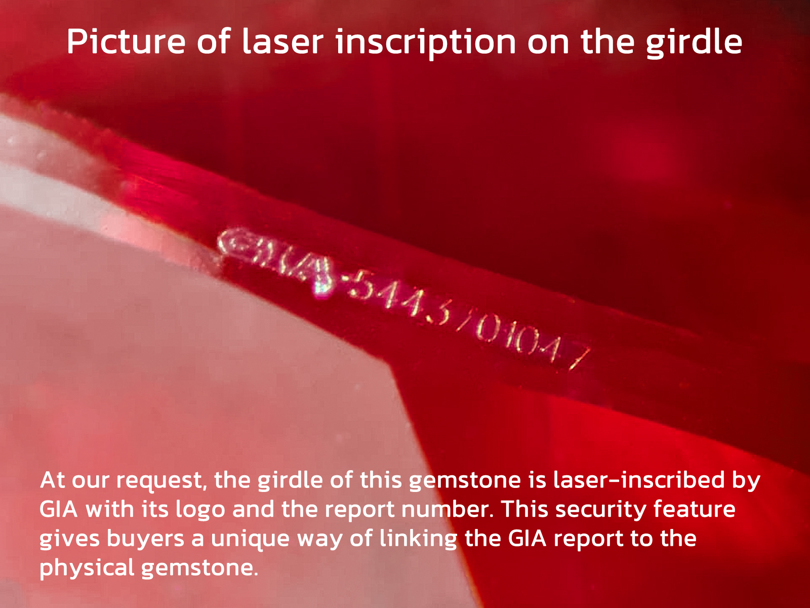 At our request, the girdle of this gemstone is laser-inscribed by GIA with its logo and the report number ("GIA 5443701047"). This security feature gives buyers a unique way of linking the GIA report to the physical gemstone.