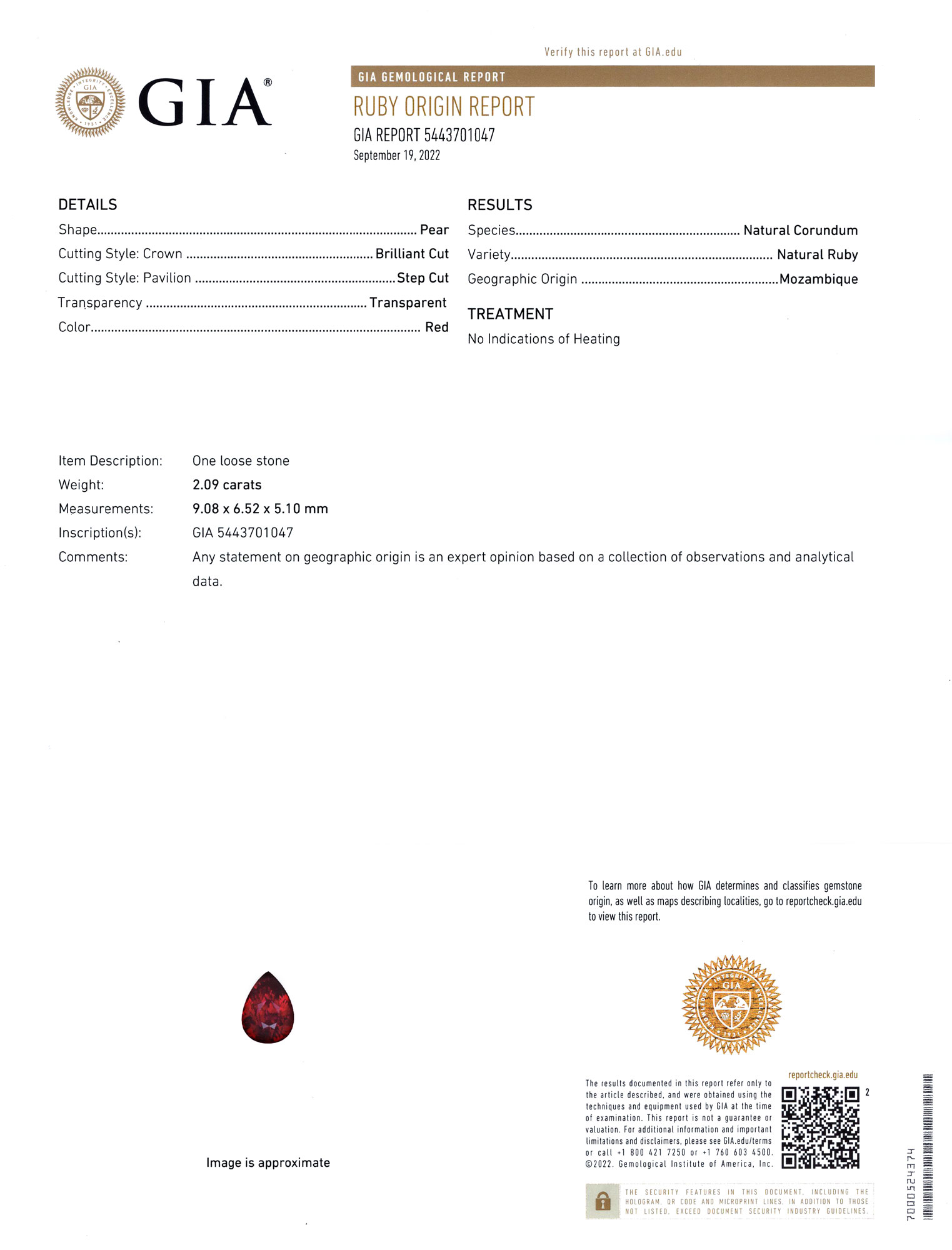 The accompanying GIA report authenticates this gemstone as a "Natural Ruby" of "Mozambique" origin with "No Indications of Heating".