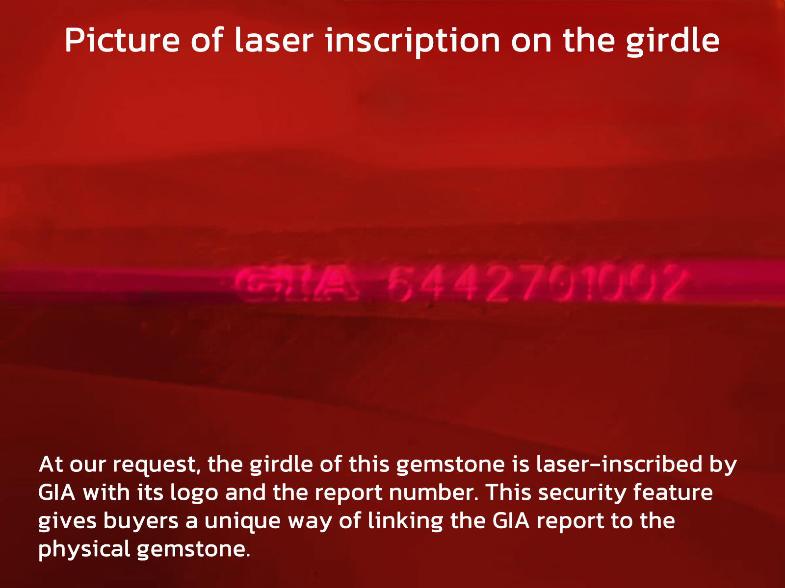 At our request, the girdle of this gemstone is laser-inscribed by GIA with its logo and the report number ("GIA 6442701002"). This security feature gives buyers a unique way of linking the GIA report to the physical gemstone.