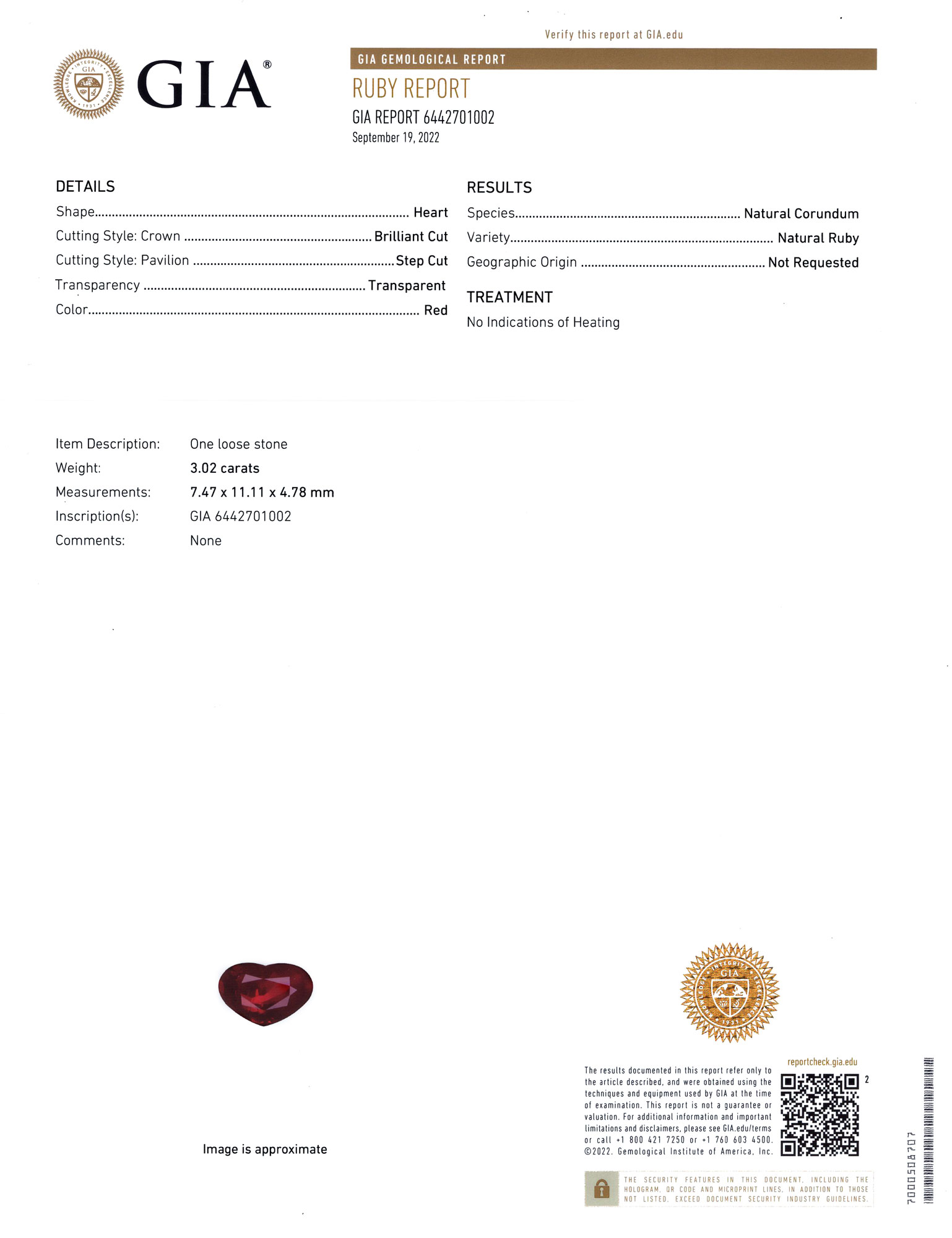 The accompanying GIA report authenticates this gemstone as a "Natural Ruby" with "No Indications of Heating".