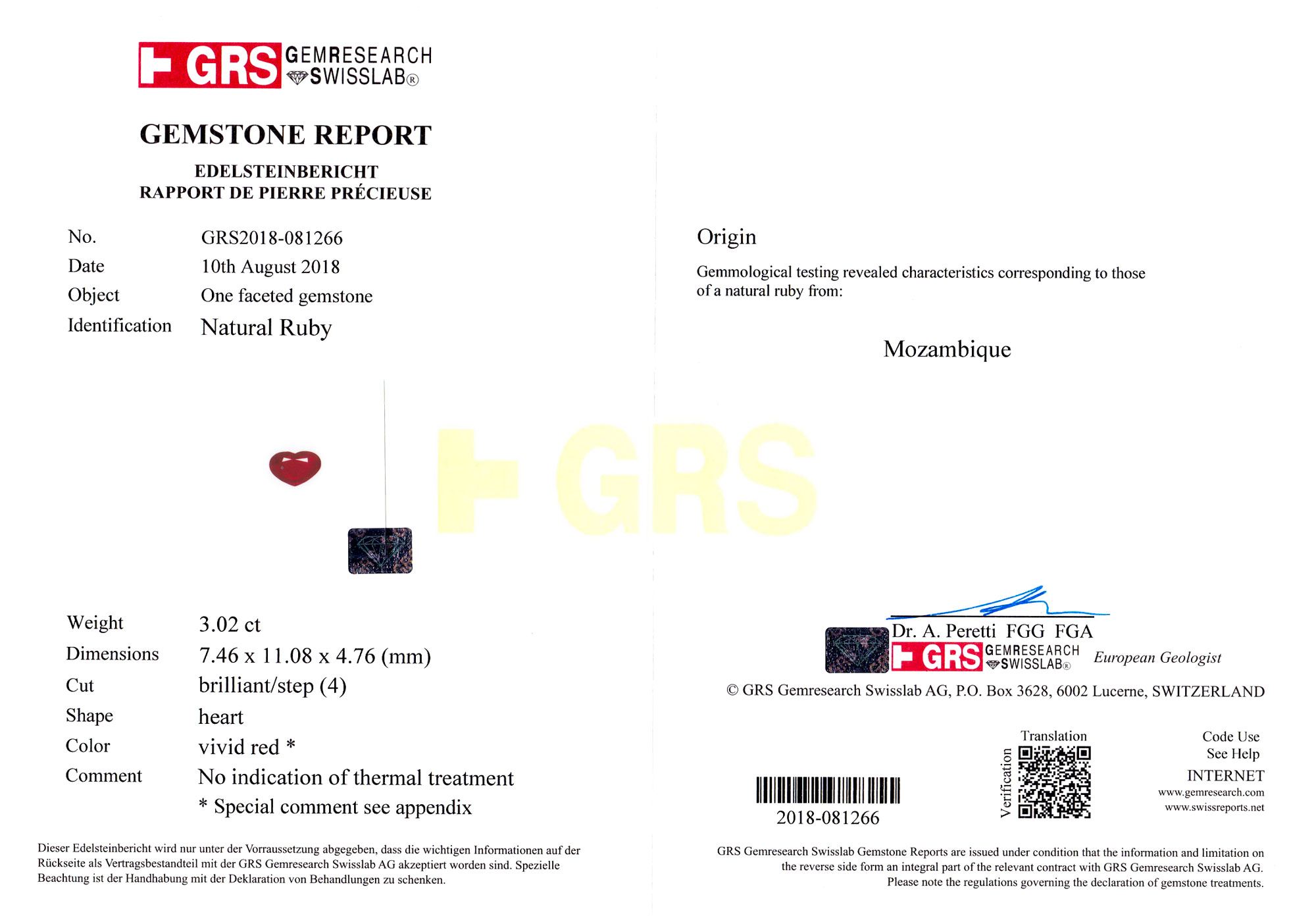 The accompanying GRS report authenticates this gemstone as a "Natural Ruby" of "Mozambique" origin with a comment stating "No indication of thermal treatment".
