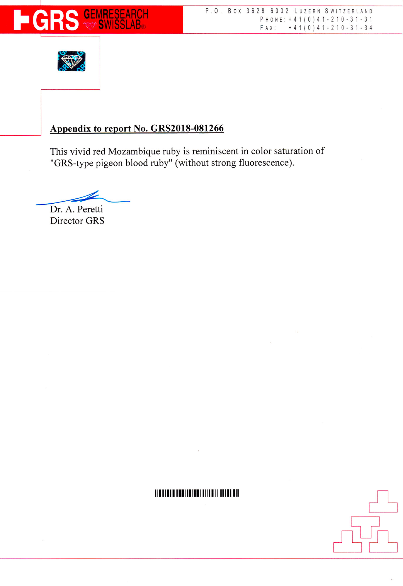 The accompanying GRS report describes the color as "vivid red" with a special comment on the appendix stating "This vivid red Mozambique ruby is reminiscent in color saturation of 'GRS-type pigeon blood ruby' (without strong fluorescence)". GRS awards this color term only to select rubies that meet their specific "pigeon's blood" color criteria.