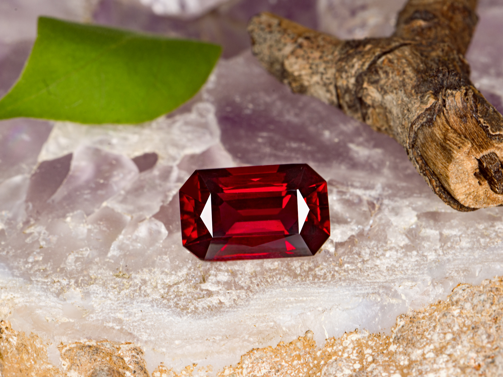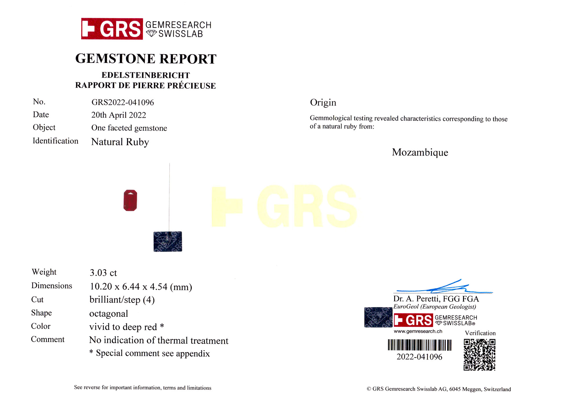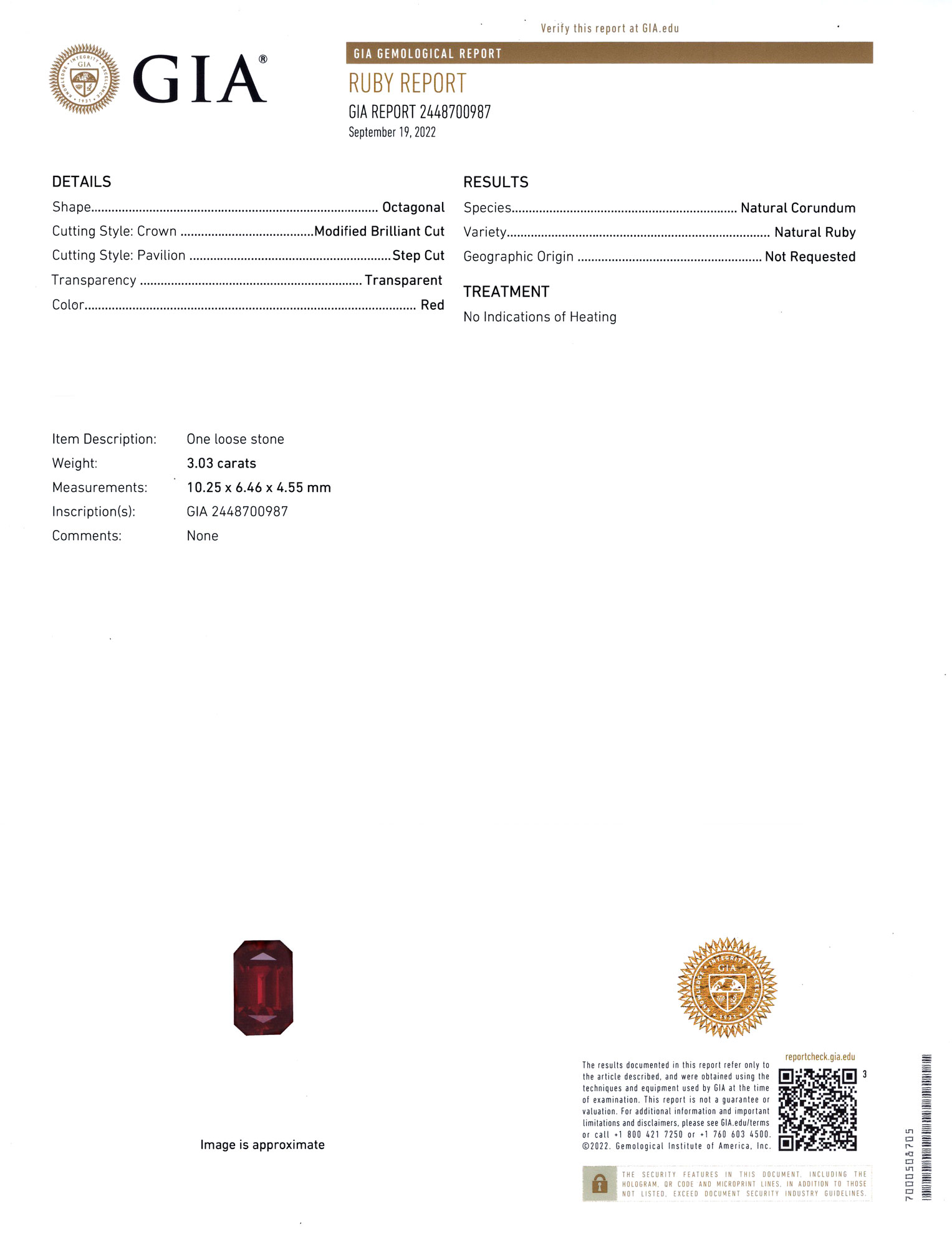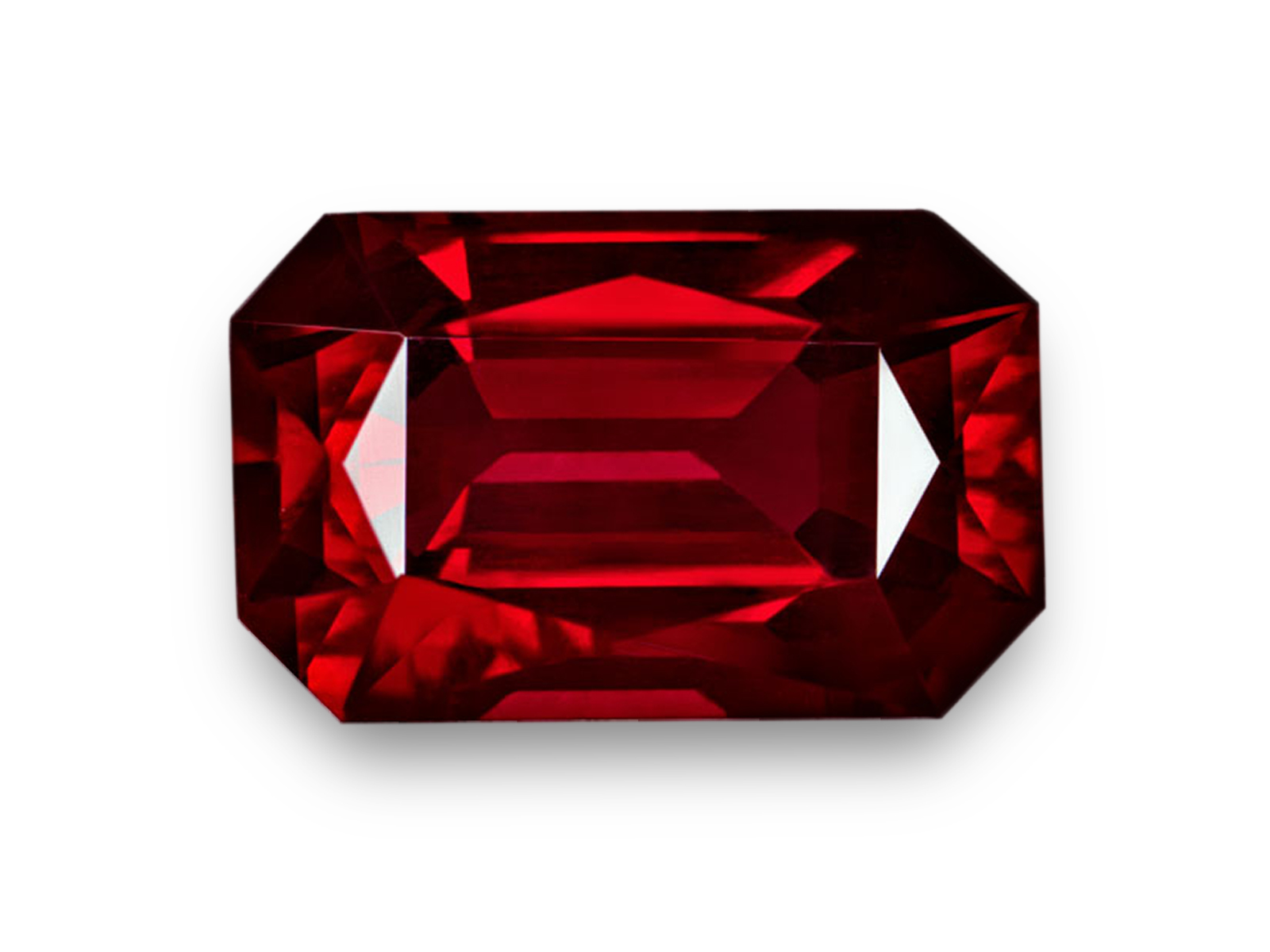 This beautiful ruby from the Niassa district in Mozambique, a region known for providing the world with the finest of these gems, is fashioned in a less-than-usual octagonal shape with a brilliant-cut crown and a step-cut pavilion faceting structure. The elongated look and dramatic crown angles produced by the shape and cut create flashes of light that are utterly desirable. Also desirable in this Mozambican ruby is the eye-clean clarity and "pigeon's blood red" color - considered the finest ruby color quality. |