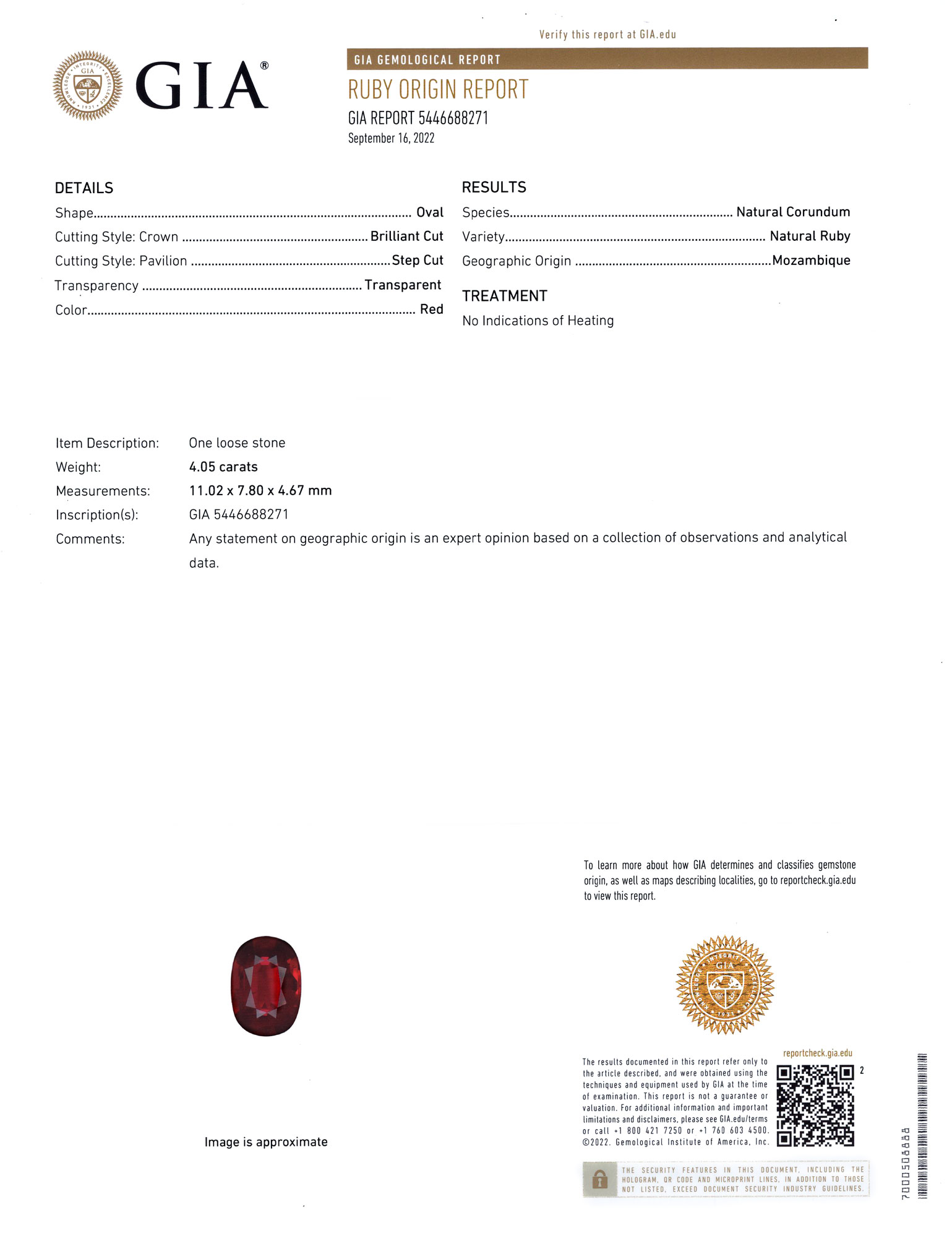 The accompanying GIA report authenticates this gemstone as a "Natural Ruby" of "Mozambique" origin with "No Indications of Heating".