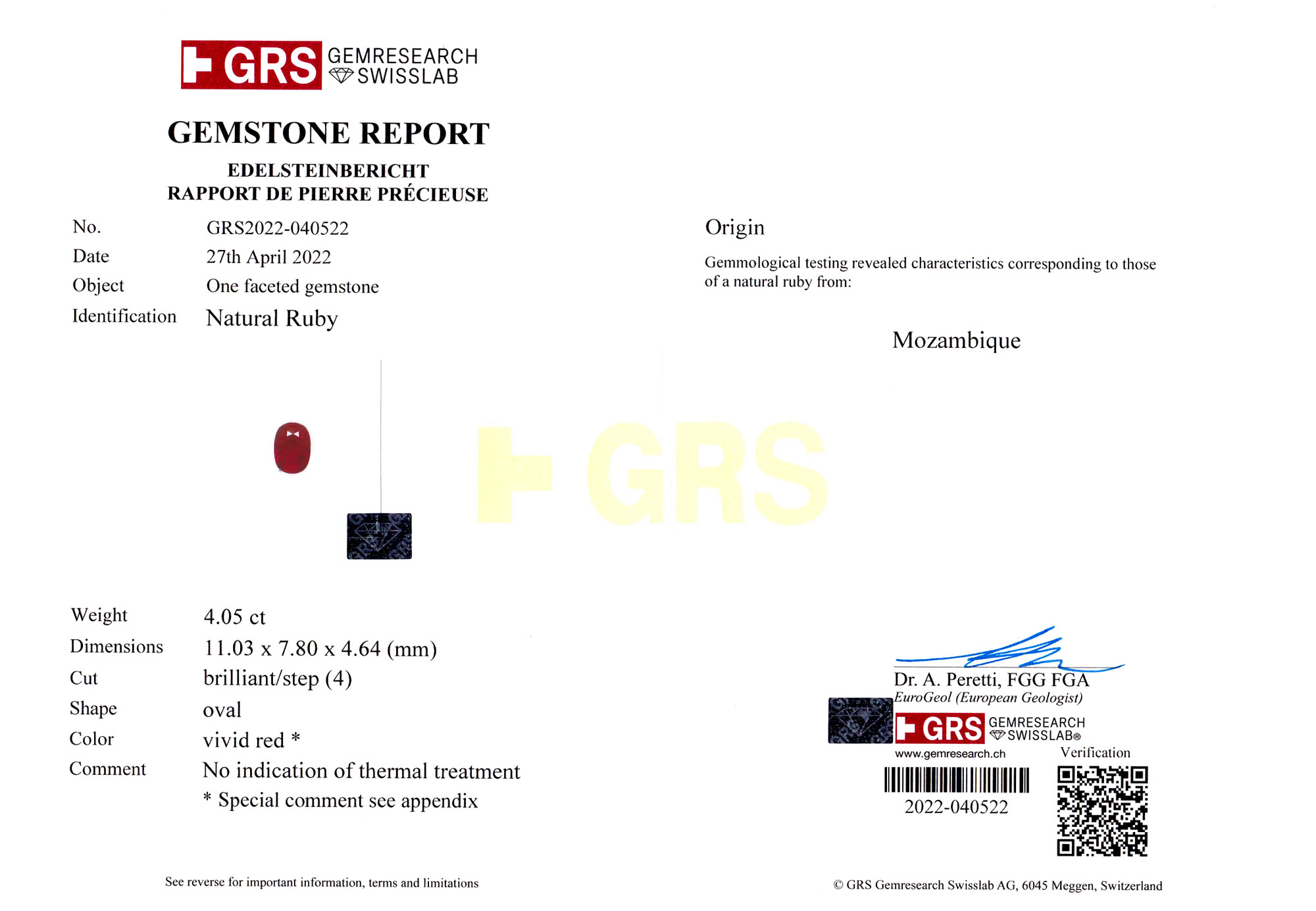 The accompanying GRS report authenticates this gemstone as a "Natural Ruby" of "Mozambique" origin with a comment stating "No indication of thermal treatment".