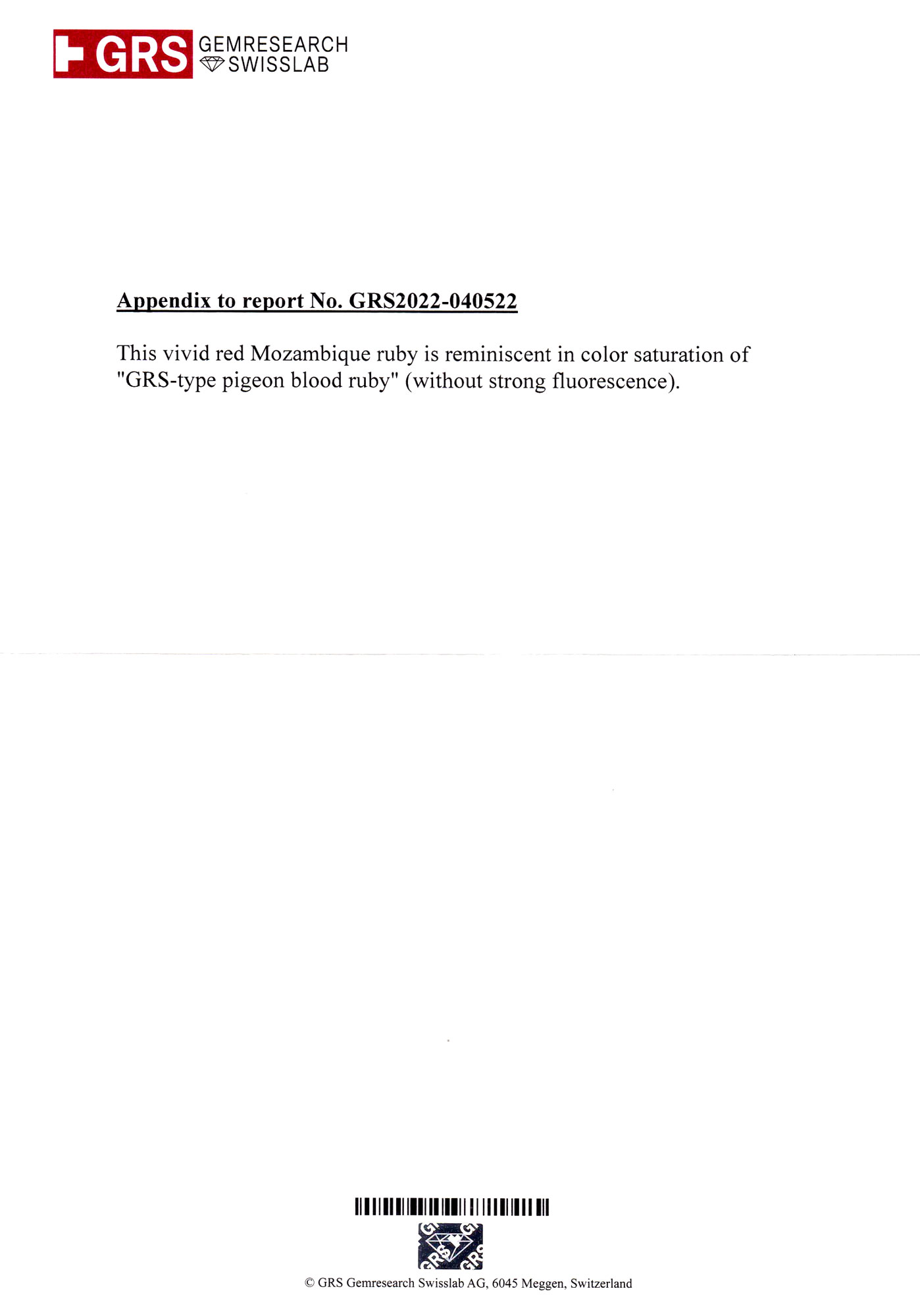 The accompanying GRS report describes the color as "vivid red" with a special comment on the appendix stating "This vivid red Mozambique ruby is reminiscent in color saturation of 'GRS-type pigeon blood ruby' (without strong fluorescence)". GRS awards this color term only to select rubies that meet their specific "pigeon's blood" color criteria.