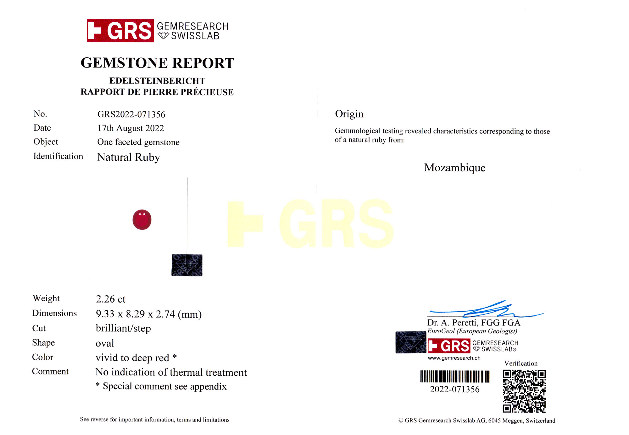 The accompanying GRS report authenticates this gemstone as a "Natural Ruby" of "Mozambique" origin with a comment stating "No indication of thermal treatment".