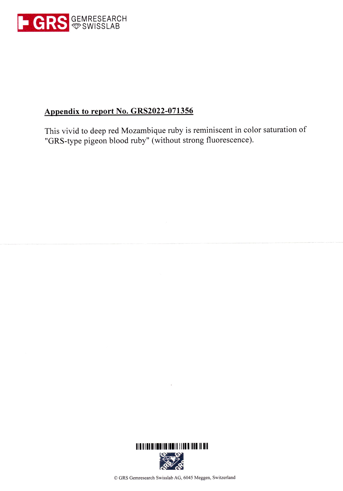 The accompanying GRS report describes the color as "vivid to deep red" with a special comment on the appendix stating "This vivid to deep red Mozambique ruby is reminiscent in color saturation of 'GRS-type pigeon blood ruby' (without strong fluorescence)". GRS awards this color term only to select rubies that meet their specific "pigeon's blood" color criteria.
