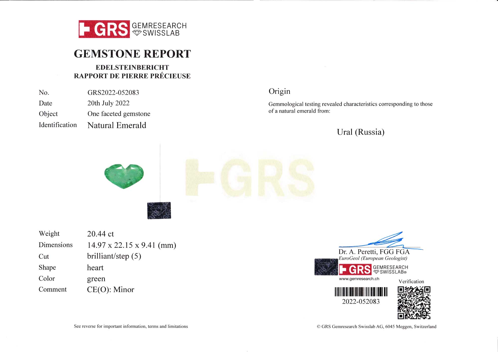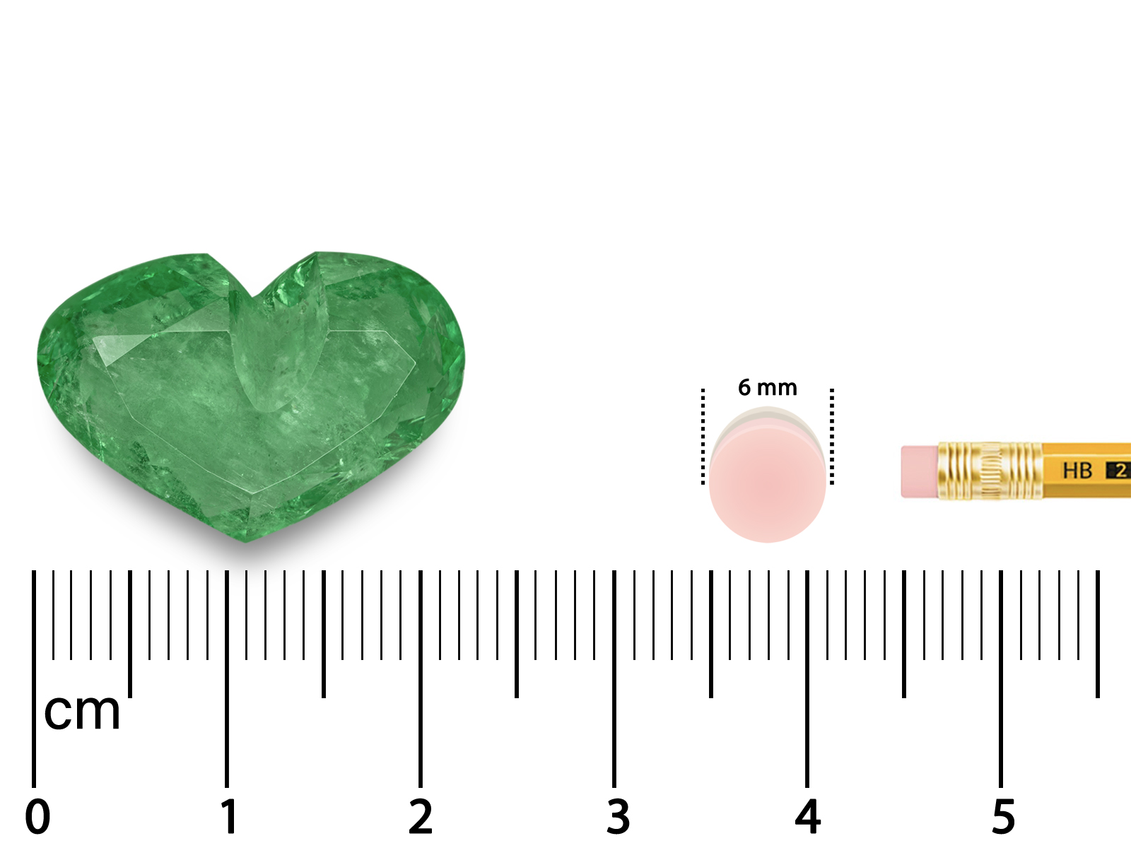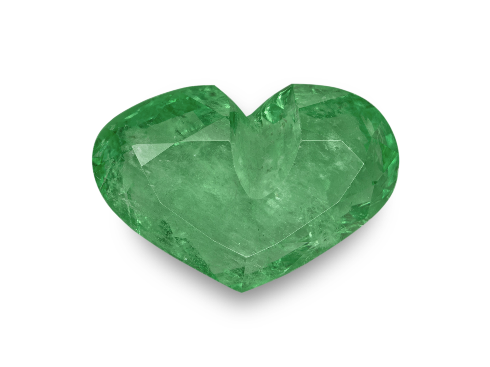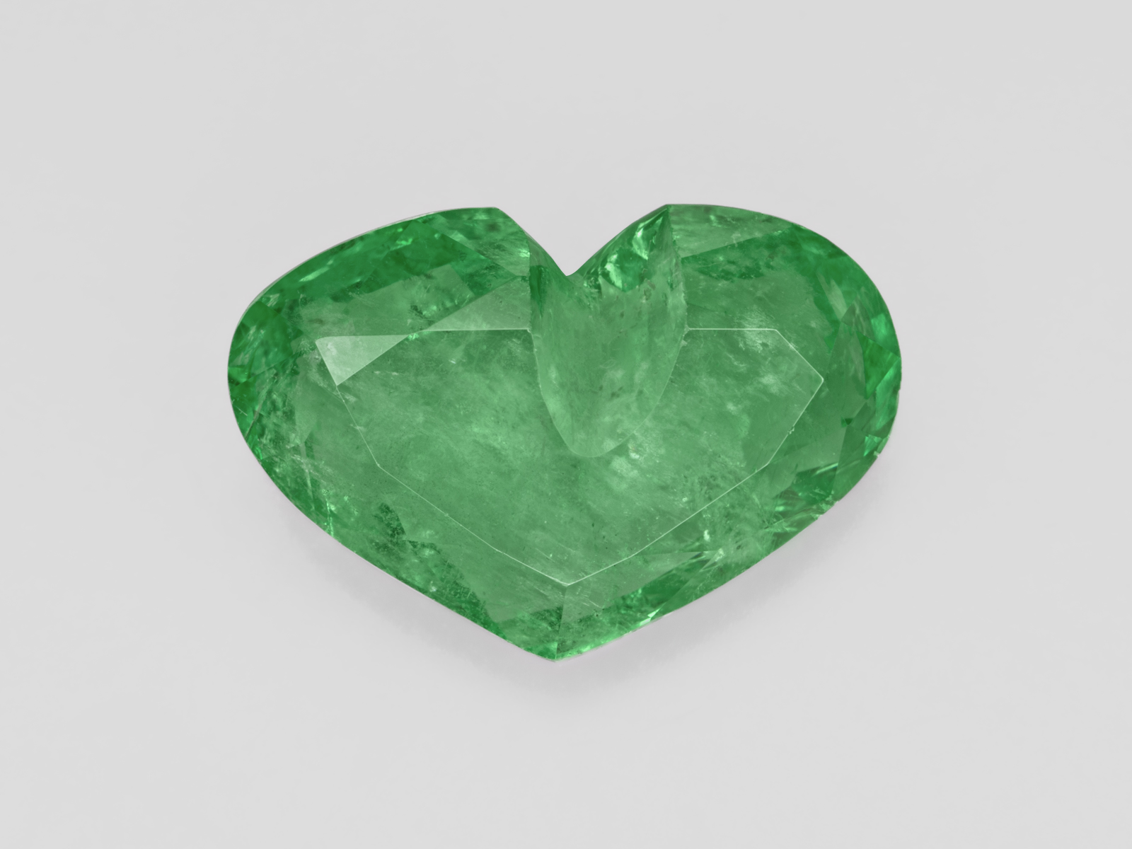 This remarkable antique-cut heart-shaped emerald from the Ural Mountains in Russia is a testimony to why the color green has such strong associations with fertility, renewal, and rebirth. Its vibrant natural color and unique internal qualities are full of life and palpable energy, while its superb transparency allows you to appreciate them both fully. |