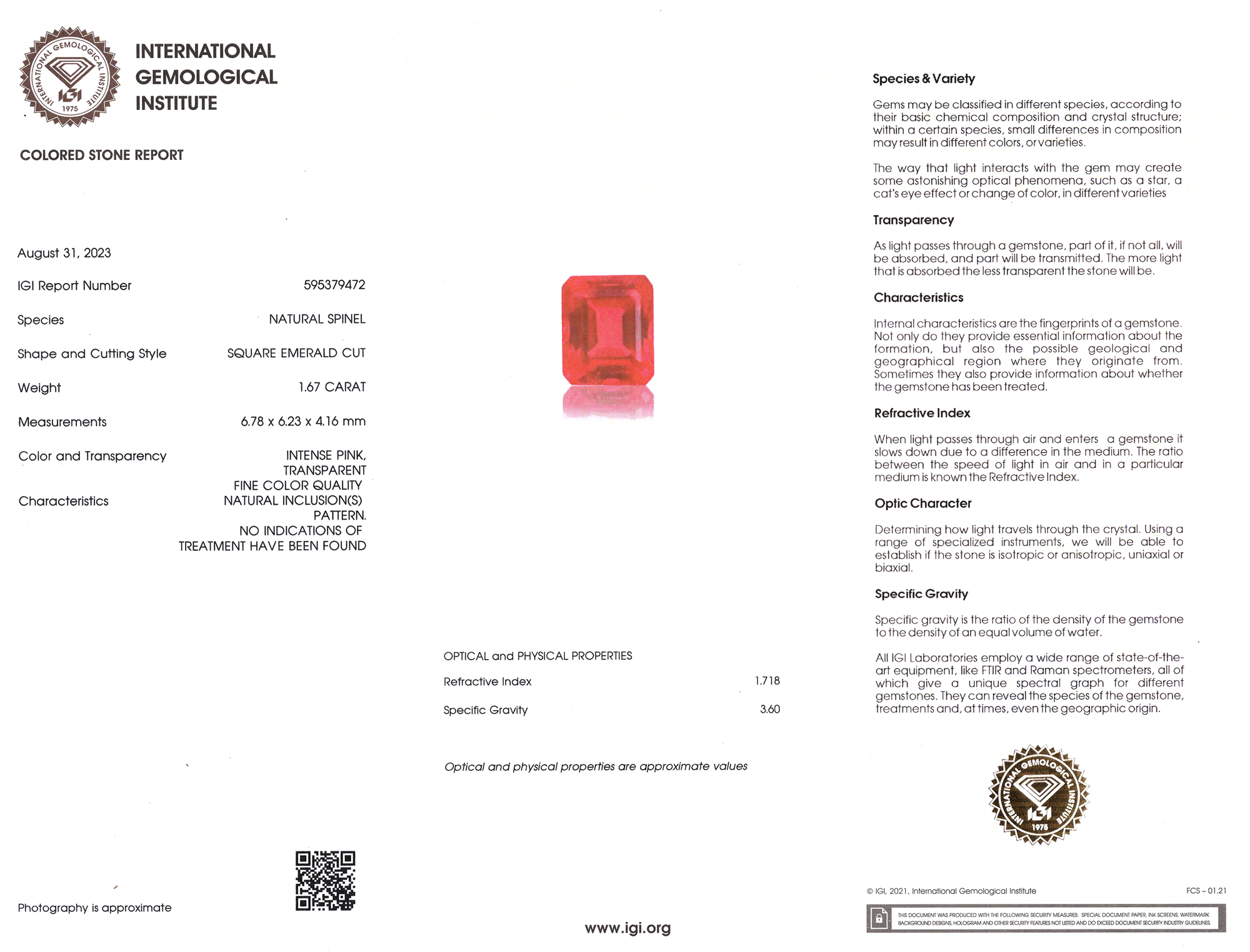 • The accompanying IGI report authenticates this gemstone as a "Natural Spinel" with a comment stating "No indications of treatment have been found".