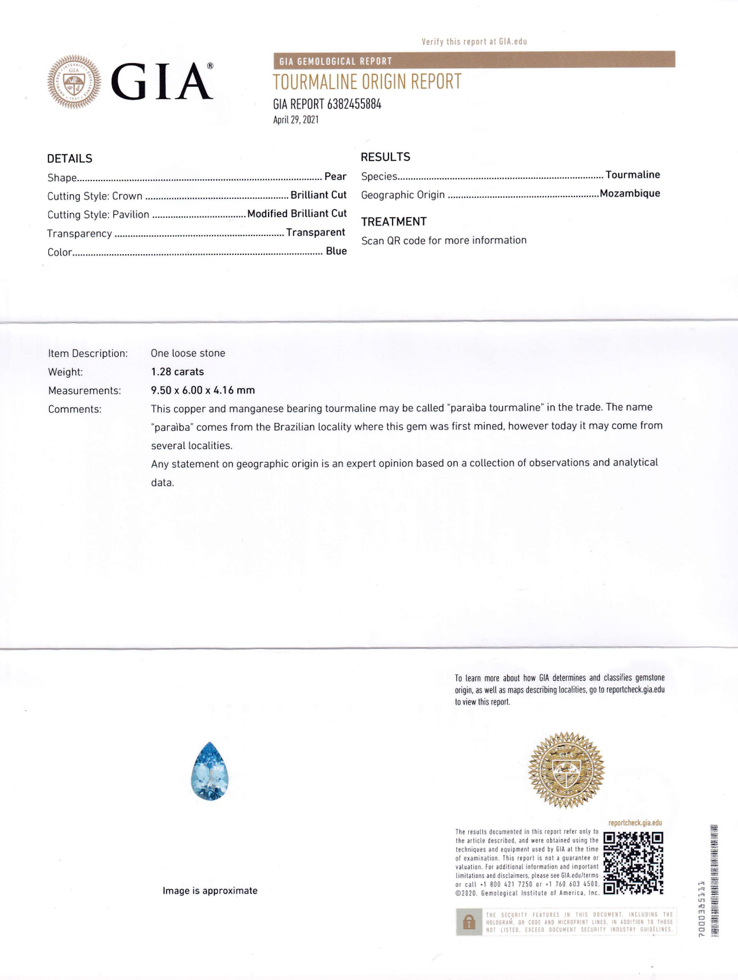 • The accompanying GIA report authenticates this gemstone as a "Natural Paraiba Tourmaline" of "Mozambique" origin.