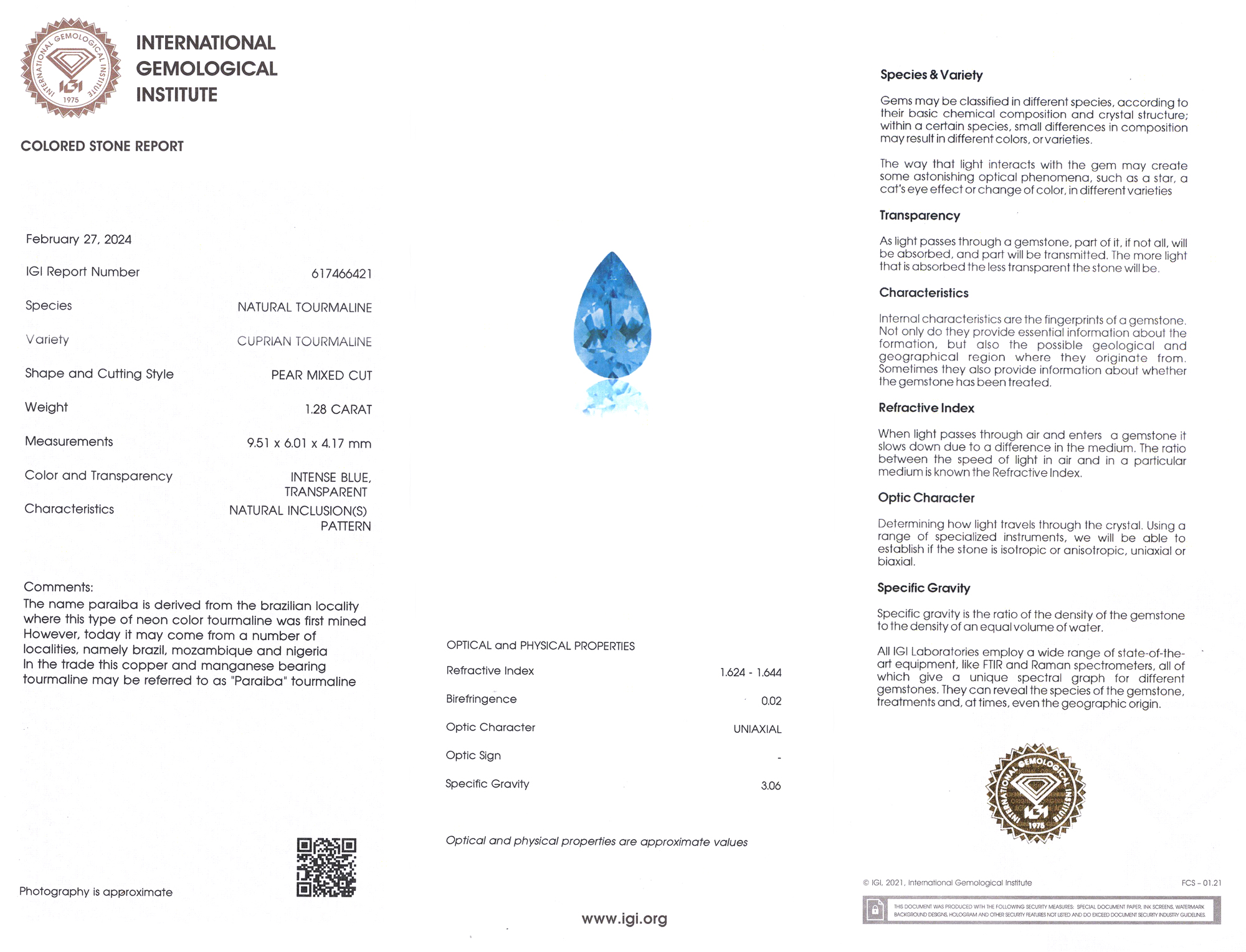 • The accompanying IGI report authenticates this gemstone as a "Natural Paraiba Tourmaline".