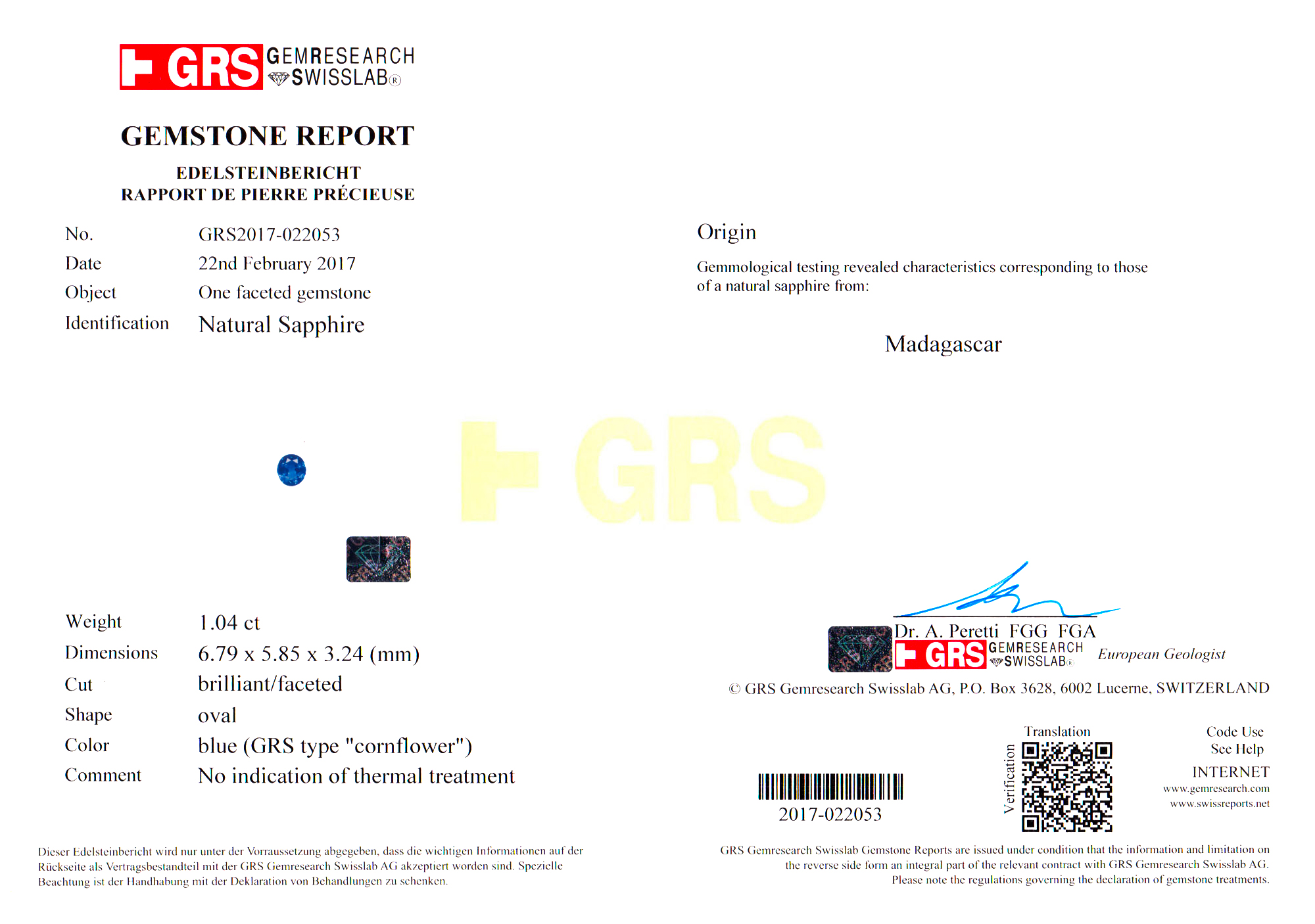 The accompanying GRS report authenticates this gemstone as a "Natural Sapphire" of "Madagascar" origin with a comment stating "No indication of thermal treatment".
