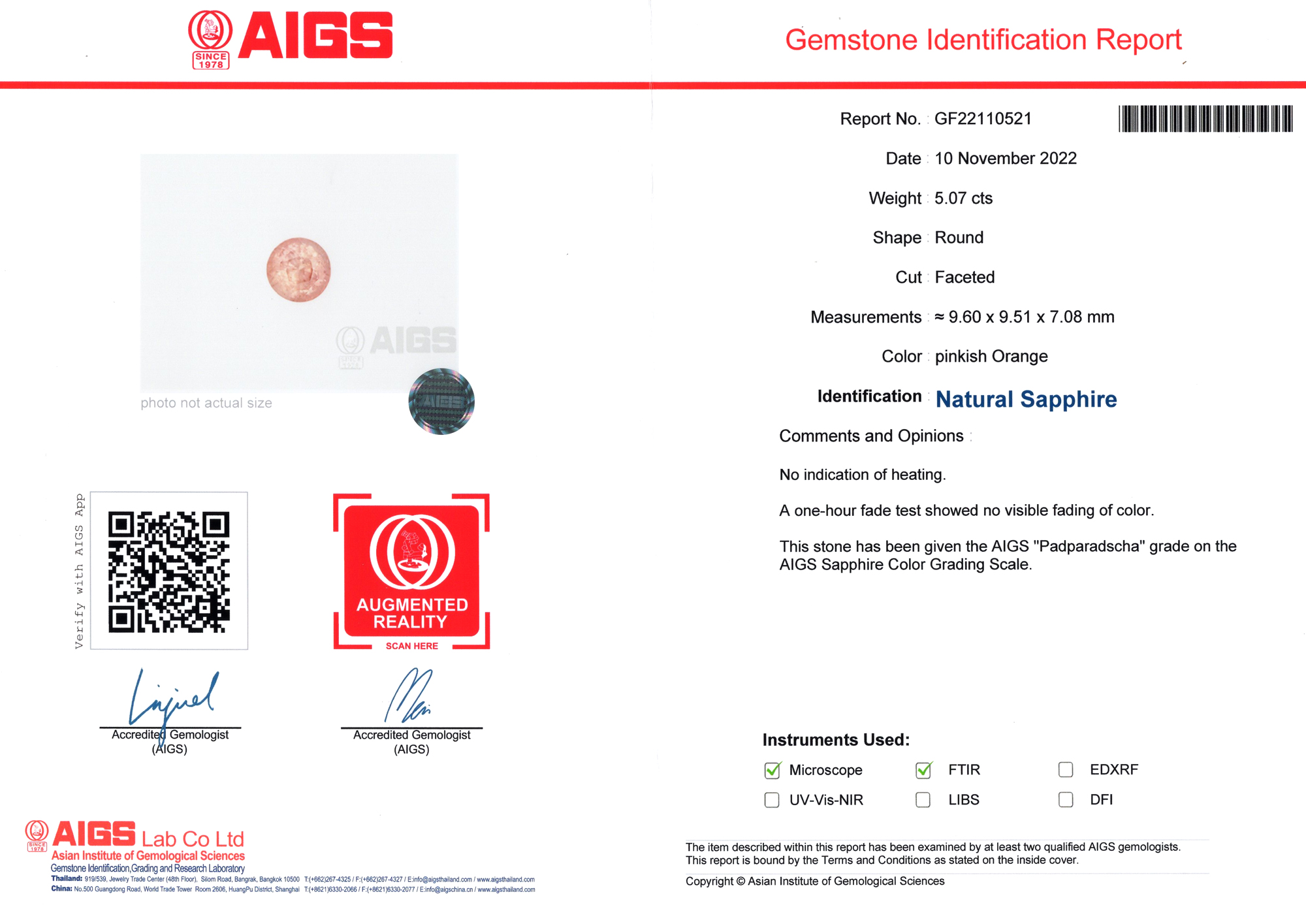 Asian Institute of Gemological Sciences report # GF22110521