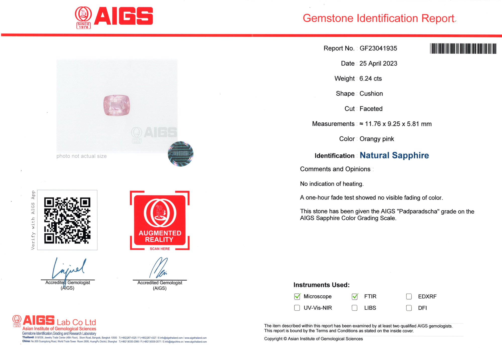 Asian Institute of Gemological Sciences report # GF23041935