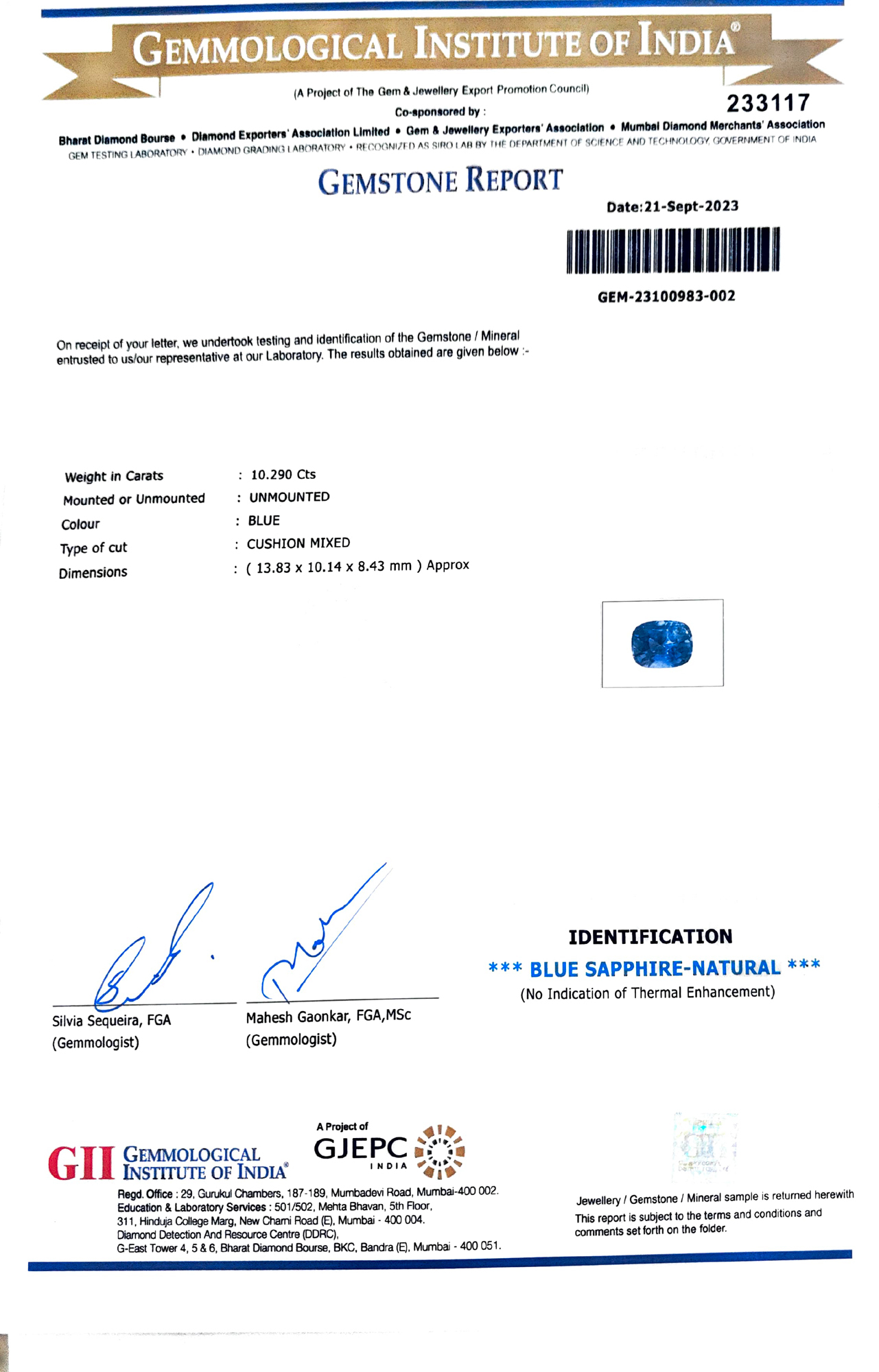 Gemmological Institute of India report # GEM-23100983-002