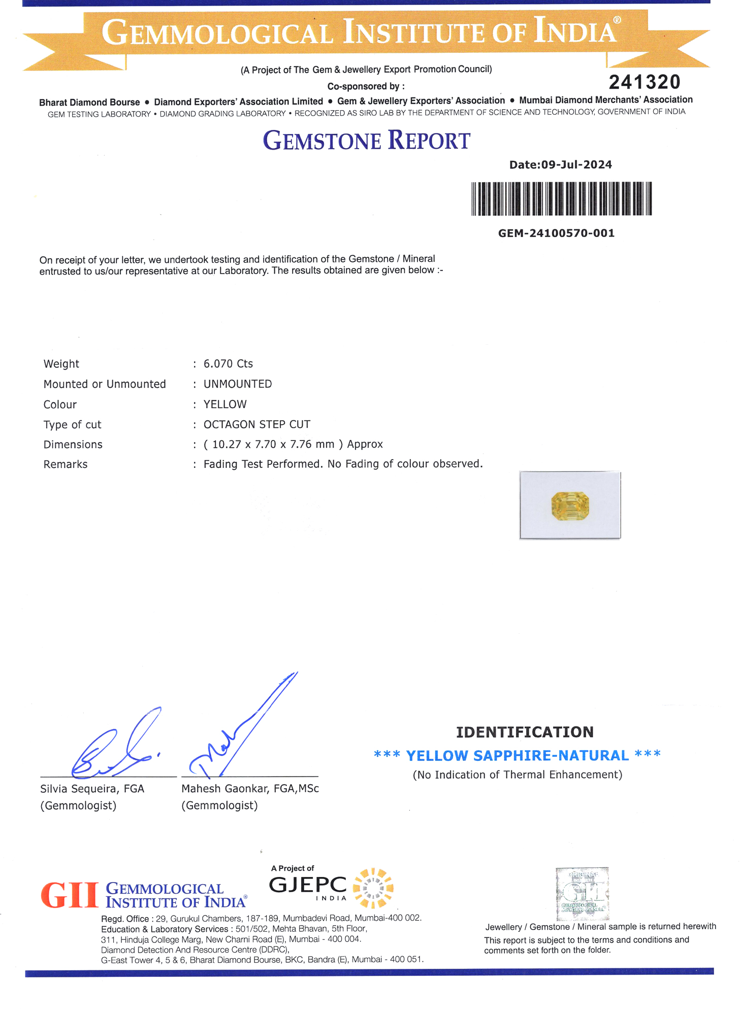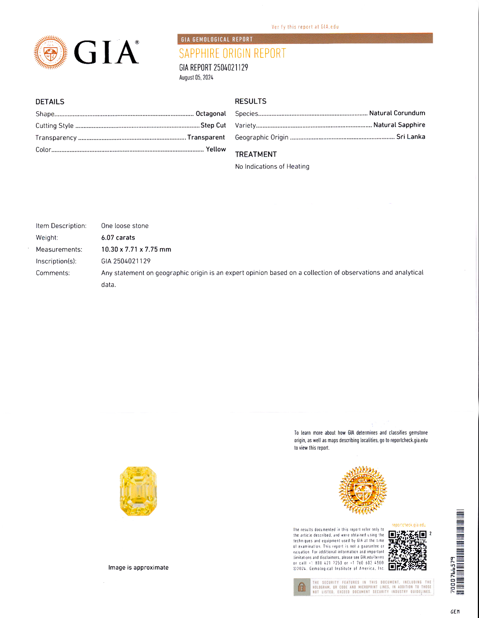 Discover the epitome of elegance with this exquisite 6.07-carat yellow sapphire, mined from the storied lands of Sri Lanka. This octagonal step-cut gem, in its mesmerizing natural golden yellow hue, radiates a captivating brilliance that is truly unparalleled. Boasting near loupe-clean clarity, a rarity in yellow sapphires exceeding 5 carats, it reveals no eye-visible inclusions, ensuring an immaculate visual delight. Each facet is meticulously cut, unveiling an exceptional luster and sparkle that dances with every movement. Fully transparent and untreated, this collector-grade gemstone is a testament to nature's purest beauty, promising to elevate any fine jewelry collection to new heights. |