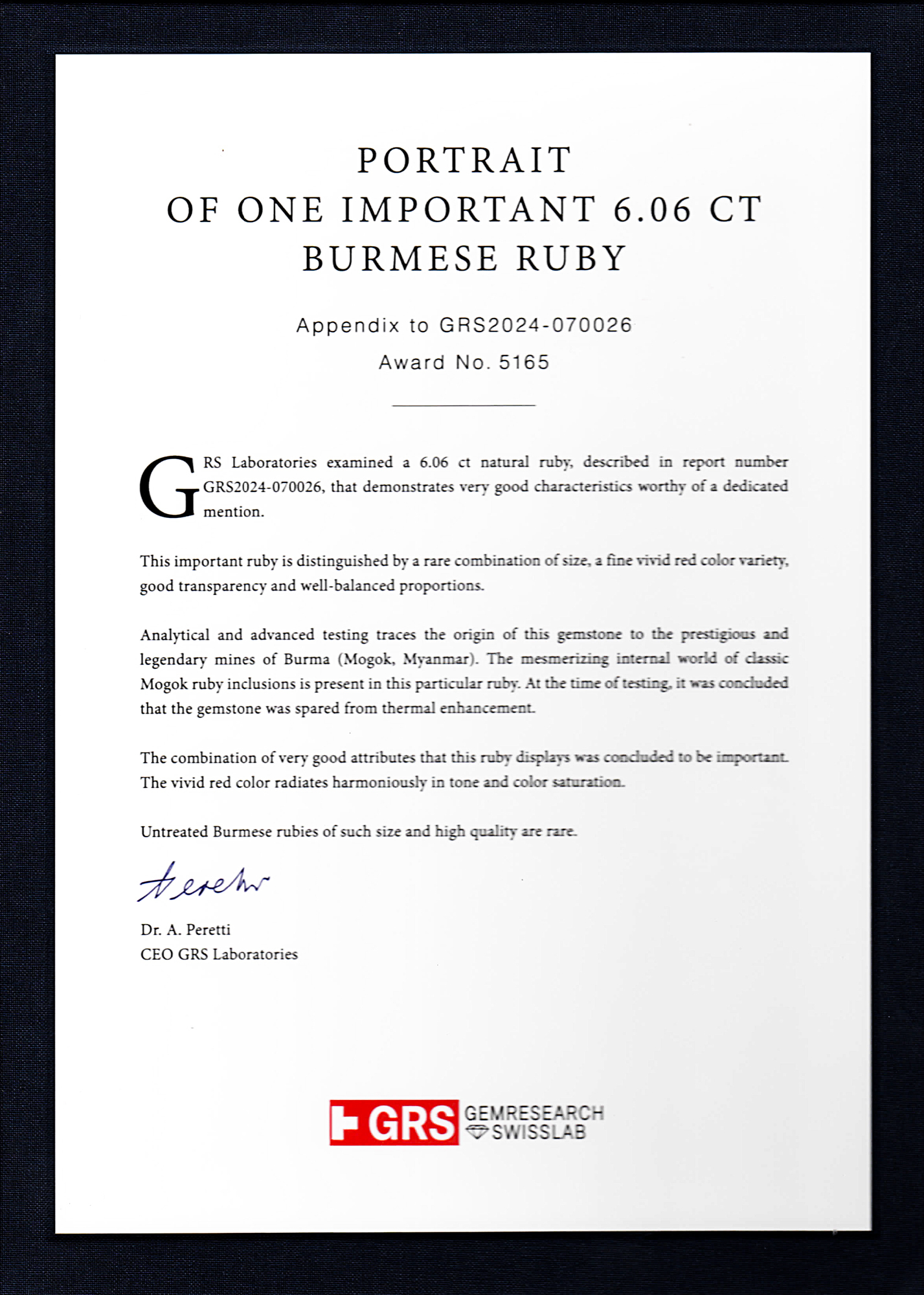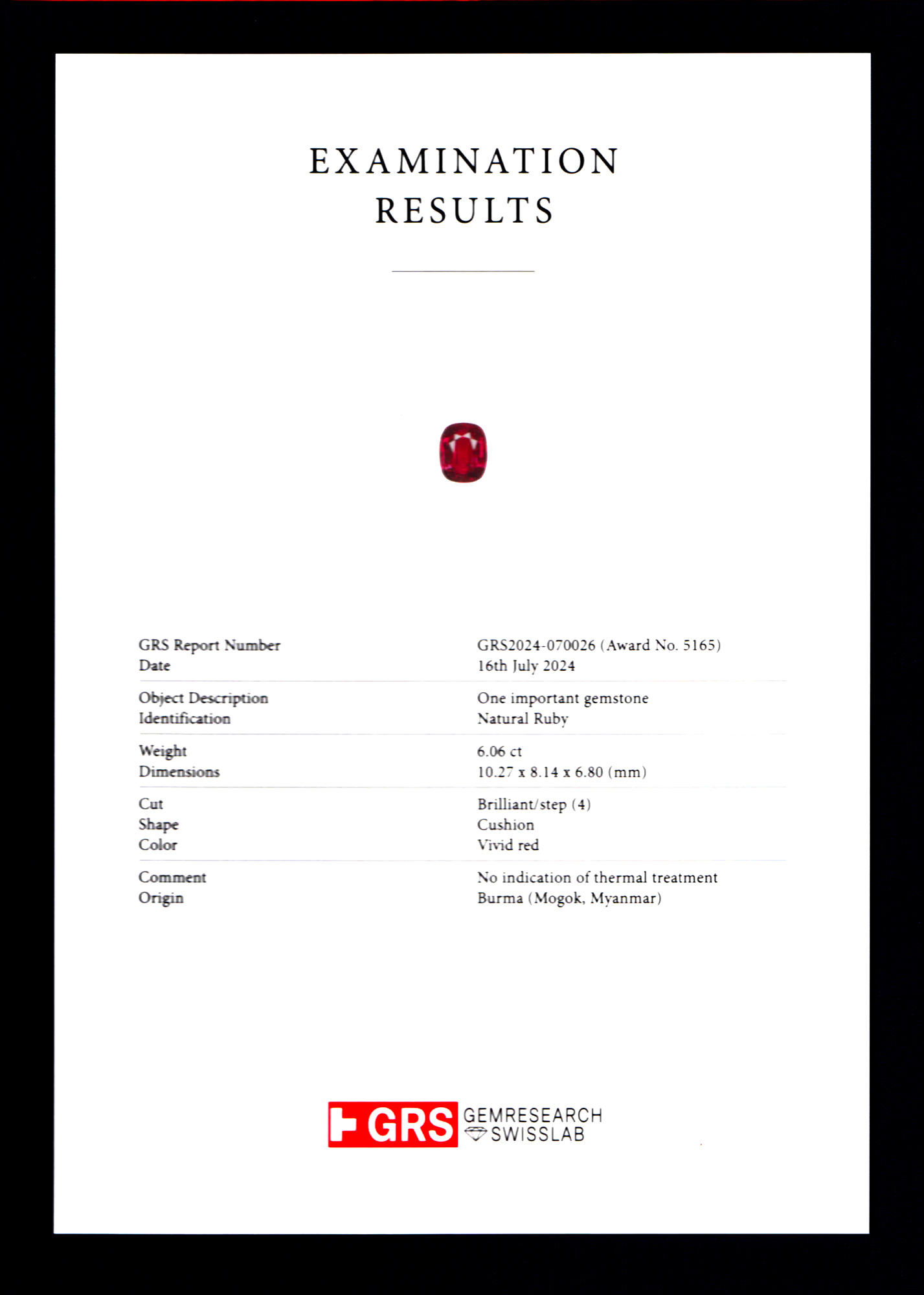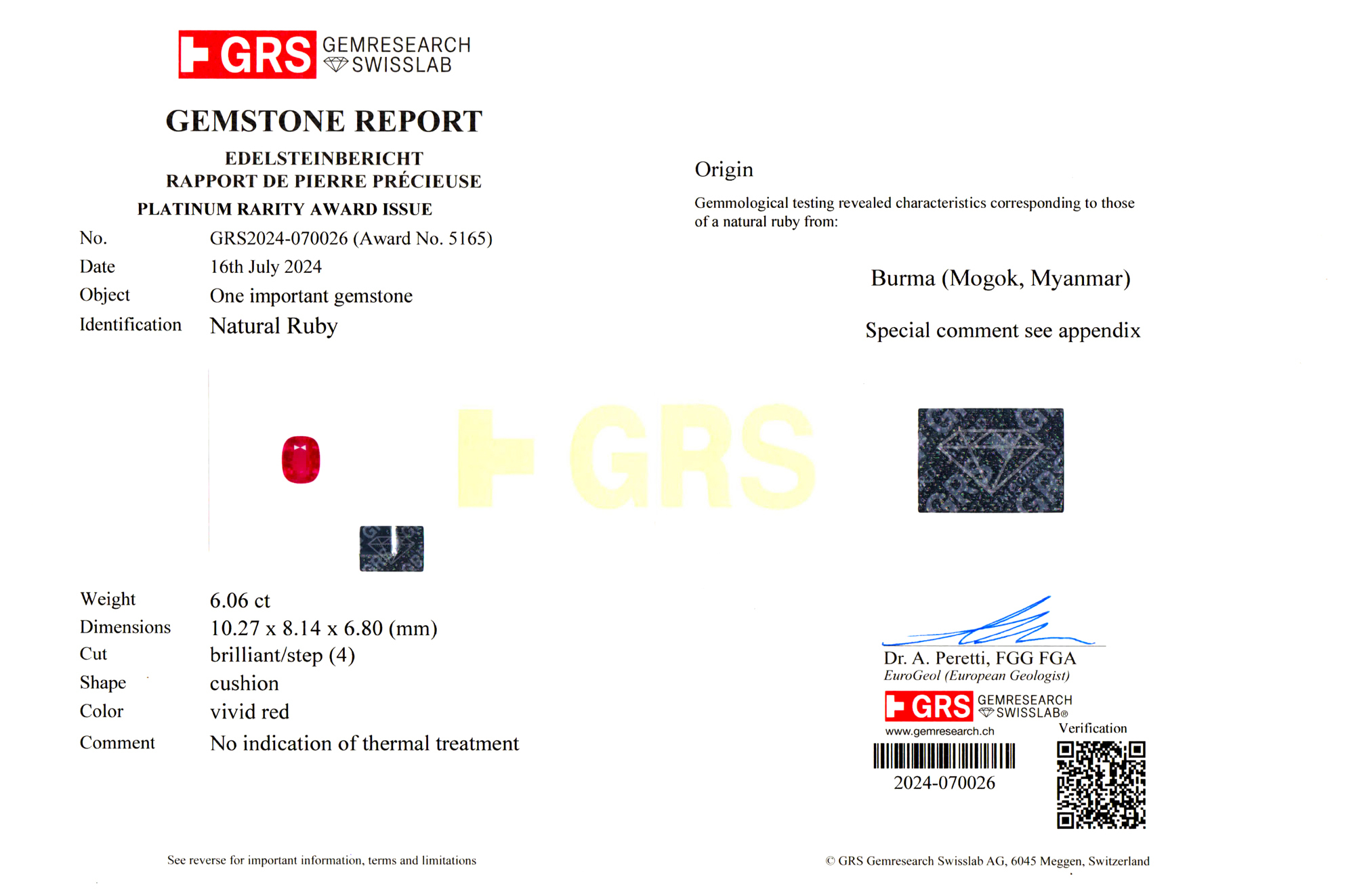 Discover a masterpiece of nature: a 6.06-carat Burmese Ruby from the legendary Mogok mines. With its rectangular cushion shape, this gem mirrors the graceful geometry of a perfectly cut crystal. Its vivid red hue, tinged with subtle magenta undertones, is entirely natural—no enhancements whatsoever. As transparent and mesmerizing as a drop of pure, radiant nectar, this ruby dazzles with an otherworldly luster. Rarely does one encounter such exceptional quality in an unheated ruby of this size. Awarded the prestigious GRS Platinum Rarity Award, it is a symbol of unparalleled luxury, destined to become the crown jewel of any fine collection. |